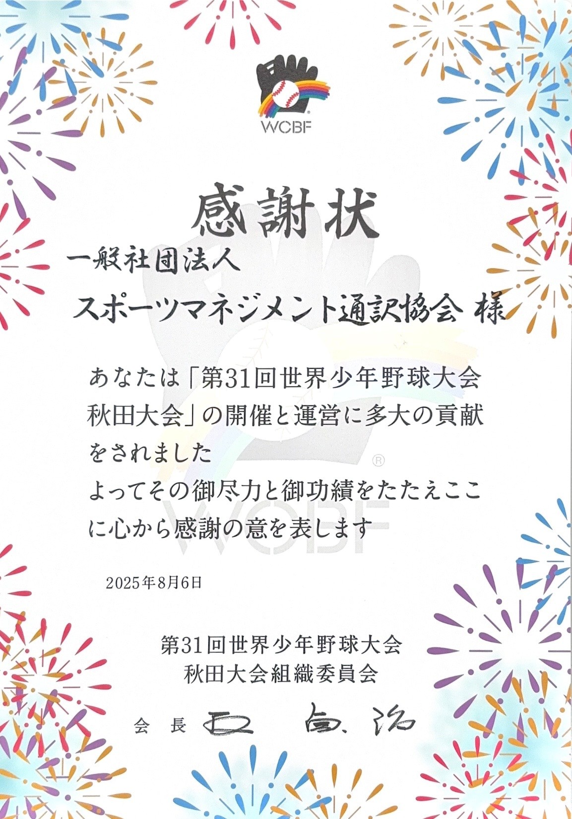 一般財団法人世界少年野球推進財団にて開催されました「第31回 世界少年野球大会 秋田大会」(2025年7月31日~8月7日)の大会組織委員会 王貞治会長より、当協会宛に感謝状が届きました。